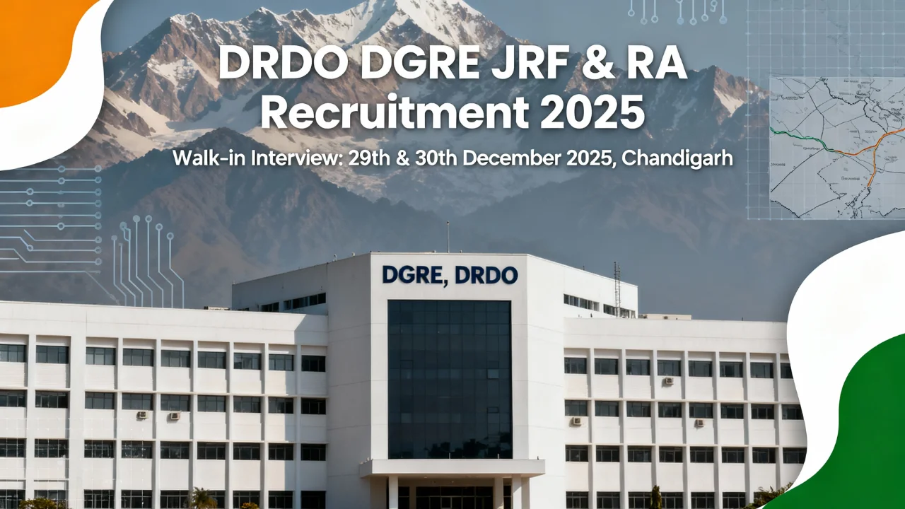 DGRE DRDO Recruitment 2025 : The Defence Geoinformatics Research Establishment (DGRE), under the Defence Research & Development Organisation (DRDO), has officially released a recruitment notification for Junior Research Fellow (JRF) and Research Associate (RA) positions on 9th December 2025. DGRE has announced 14 vacancies for various engineering and science disciplines. Interested candidates can appear for a Walk-in Interview on 29th & 30th December 2025 at DGRE Chandigarh.