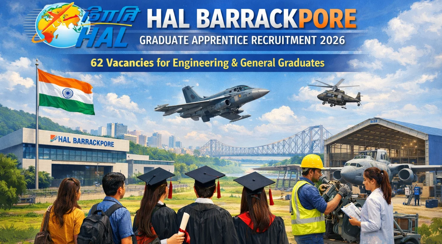 Hindustan Aeronautics Limited (HAL), Barrackpore Division has officially released the HAL Apprentice Recruitment 2026 for engagement of Apprentices under the Apprentices Act, 1961. HAL has announced 62 vacancies for the One Year Apprenticeship Training Programme for the year 2026-27. Eligible Indian citizens can attend the walk-in interview from 28th to 30th January 2026 at HAL, Barrackpore. Applicants must register on the NATS 2.0 portal before applying and ensure they meet the eligibility criteria.