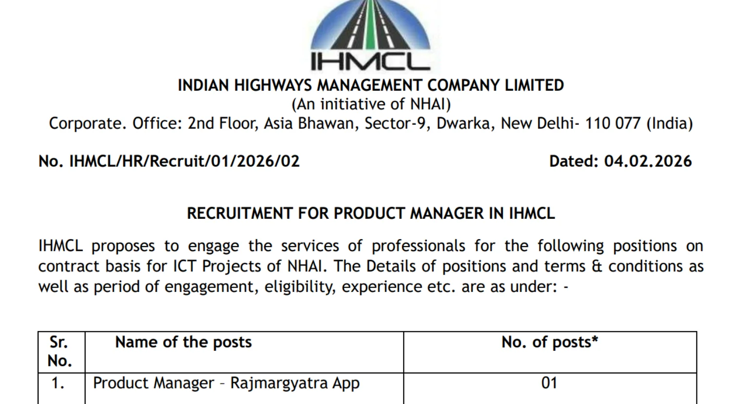 IHMCL Recruitment 2026 : Indian Highways Management Company Limited (IHMCL), an initiative of the National Highways Authority of India (NHAI), has officially released the IHMCL Product Manager Recruitment 2026 notification on 4th February 2026. IHMCL has announced vacancies for Product Managers for the Rajmargyatra App and the 1033 Helpline to work on ICT projects of NHAI. Interested and eligible candidates can apply by email or registered post before 3rd March 2026.