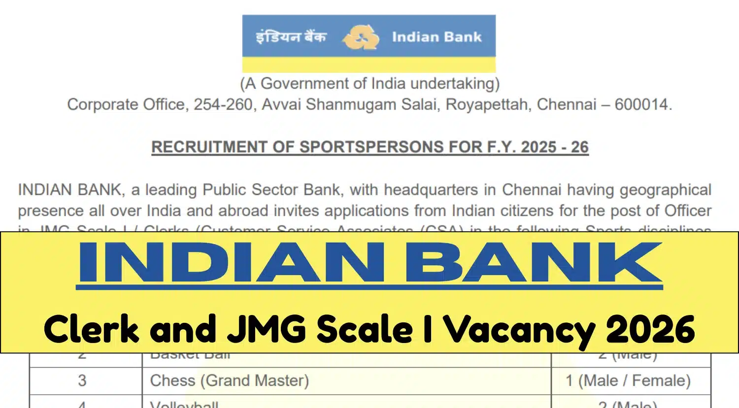 Indian Bank Sportsperson Recruitment 2026 : Indian Bank invites applications from Indian citizens for the post of Officer in JMG Scale I and Clerks (Customer Service Associates) under the Sports Quota for the Financial Year 2025-26. The Bank has announced a total of 7 vacancies across Athletics, Basketball, Chess, and Volleyball disciplines. The online application for this recruitment begins on 4th February 2026 and ends on 24th February 2026. Candidates have to apply for this recruitment opportunity only on the official website.