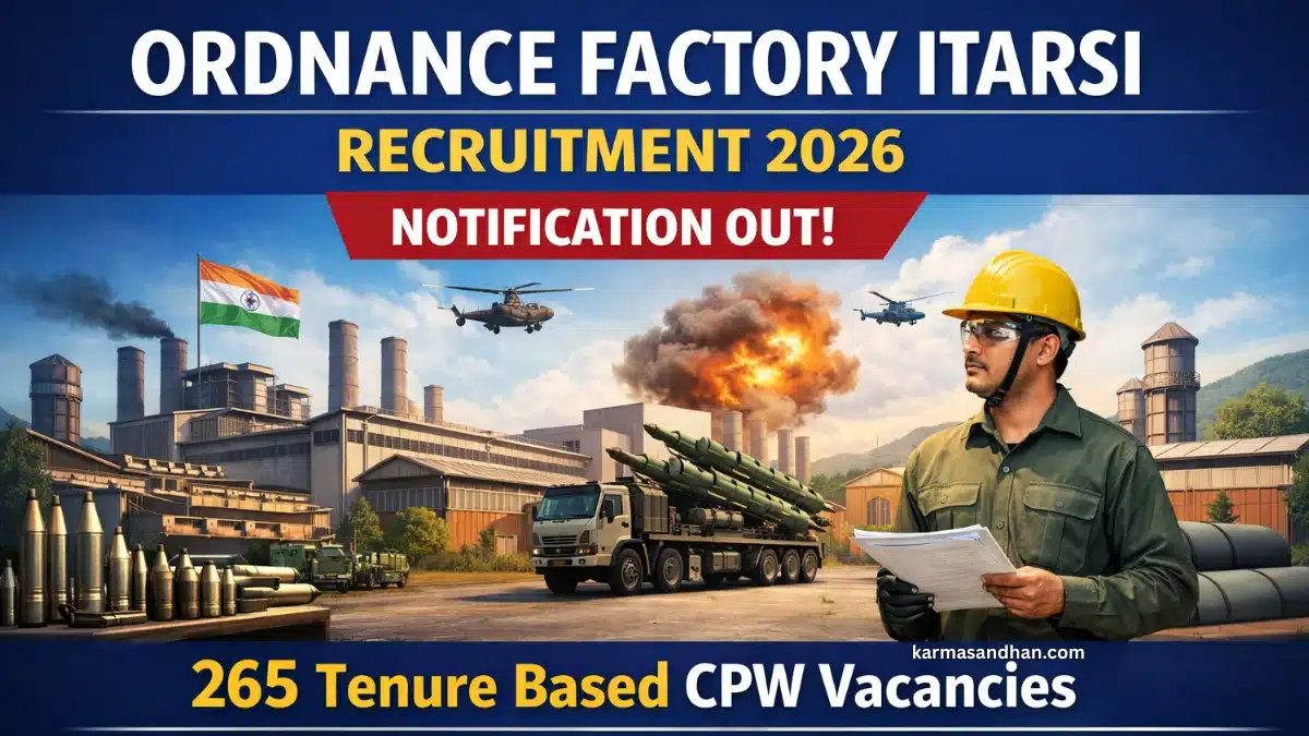 OFI Recruitment 2026 : has released a notification for the engagement of Tenure Based Chemical Process Worker (CPW) personnel. The factory has announced 265 vacancies for skilled workers on a contract basis. The offline application process has begun, and candidates must send their applications via post to reach the factory by the last date. This Ordnance Factory Itarsi Recruitment 2026 is a significant opportunity for candidates with an NCVT certification in AOCP or related feeder trades to gain experience in a defence manufacturing unit.