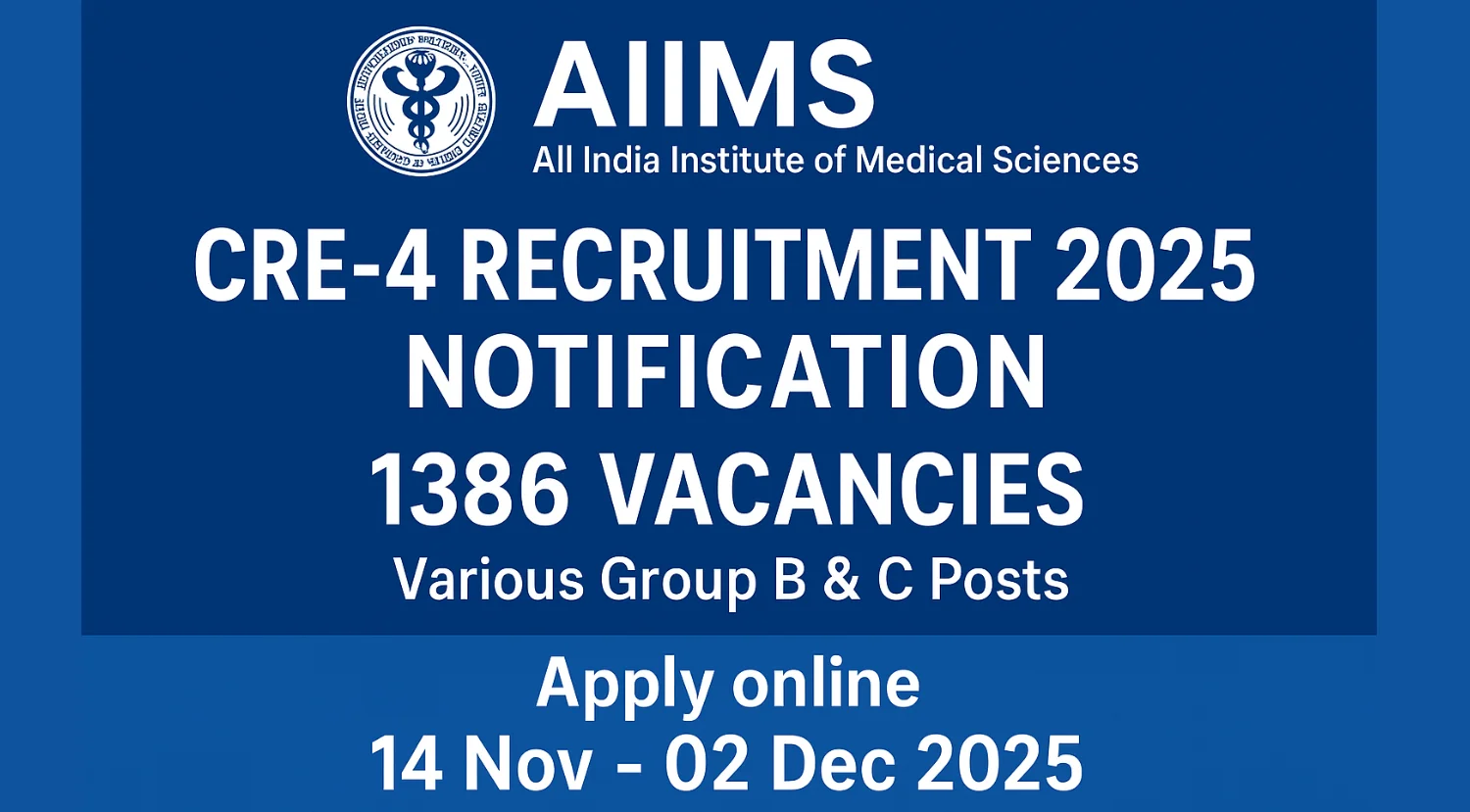1386 Posts – The All India Institute of Medical Sciences – AIIMS CRE Recruitment 2025 – Last Date 02 December Govt Exam Update