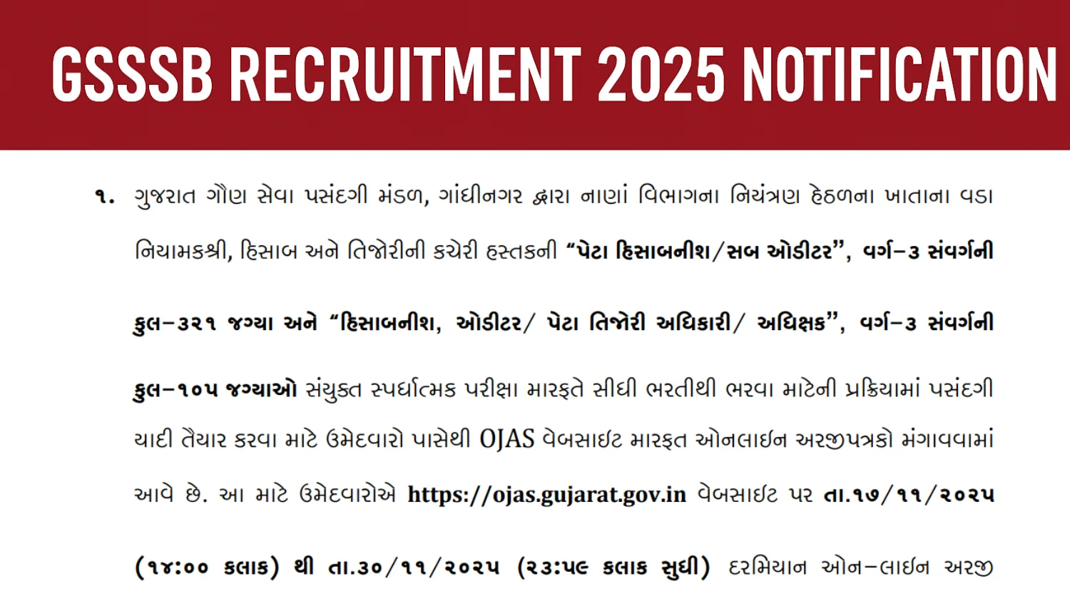 The Gujarat Gaun Seva Pasandgi Mandal (GSSSB) has officially released the GSSSB Recruitment 2025 Notification (Advertisement No. 366/202526) on 15th November 2025. GSSSB has announced 426 vacancies for the posts of Sub Accountant/Sub Auditor, Class-3 and Accountant, Auditor/Deputy Treasury Officer, Class-3 under the Finance Department. Interested candidates can apply online from 17th November 2025 (2:00 … Read more