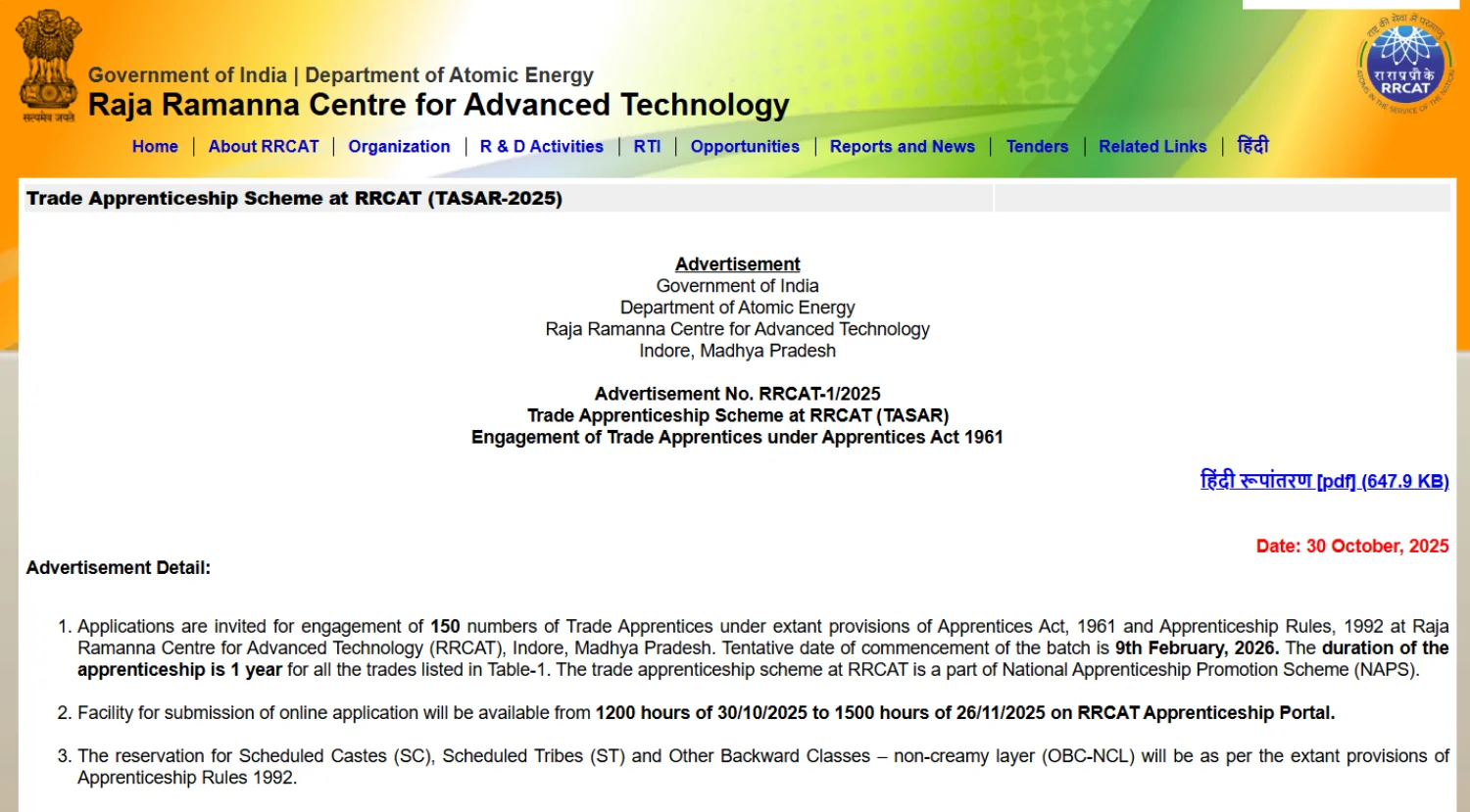 150 Posts – The Raja Ramanna Centre for Advanced Technology – RRCAT Apprentice Recruitment 2025 – Last Date 26 November Govt Exam Update