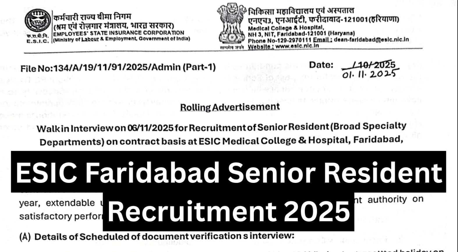 The Employees’ State Insurance Corporation – ESIC Senior Resident Recruitment 2025 – Last Date 06 November Govt Exam Update