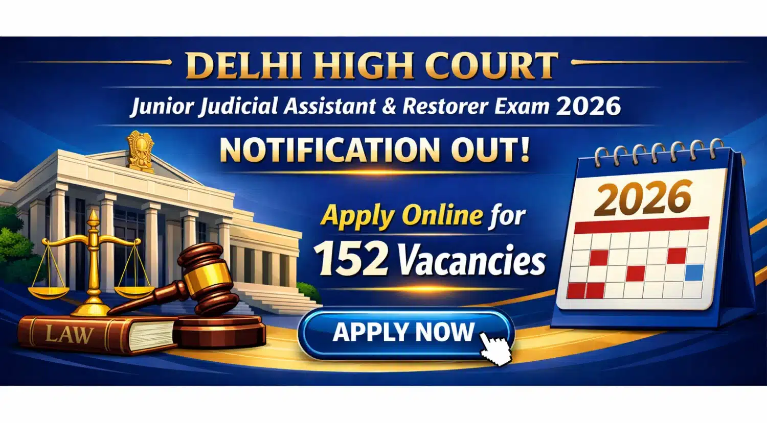 Delhi High Court Recruitment 2026 : Delhi High Court has announced the recruitment of 152 Junior Judicial Assistant/Restorer (Group-B) posts through open examination. The online application process begins on 4th February 2026 and ends on 23rd February 2026. Candidates must apply only through the official website www.delhihighcourt.nic.in. This recruitment offers a prestigious career opportunity in … Read more