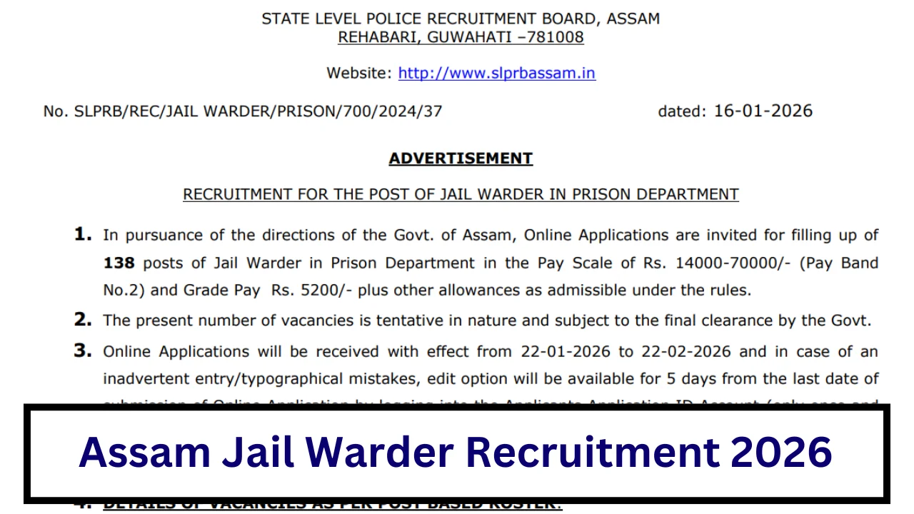 SLPRB Jail Warder Recruitment 2026 :The State Level Police Recruitment Board (SLPRB), Assam has officially released the Assam Jail Warder Recruitment 2026 Notification on 16th January 2026. SLPRB Assam has announced 138 vacancies for the Jail Warder position in the Prison Department. Interested candidates can apply online from January 22 to February 22, 2026 through the official SLPRB Assam website.