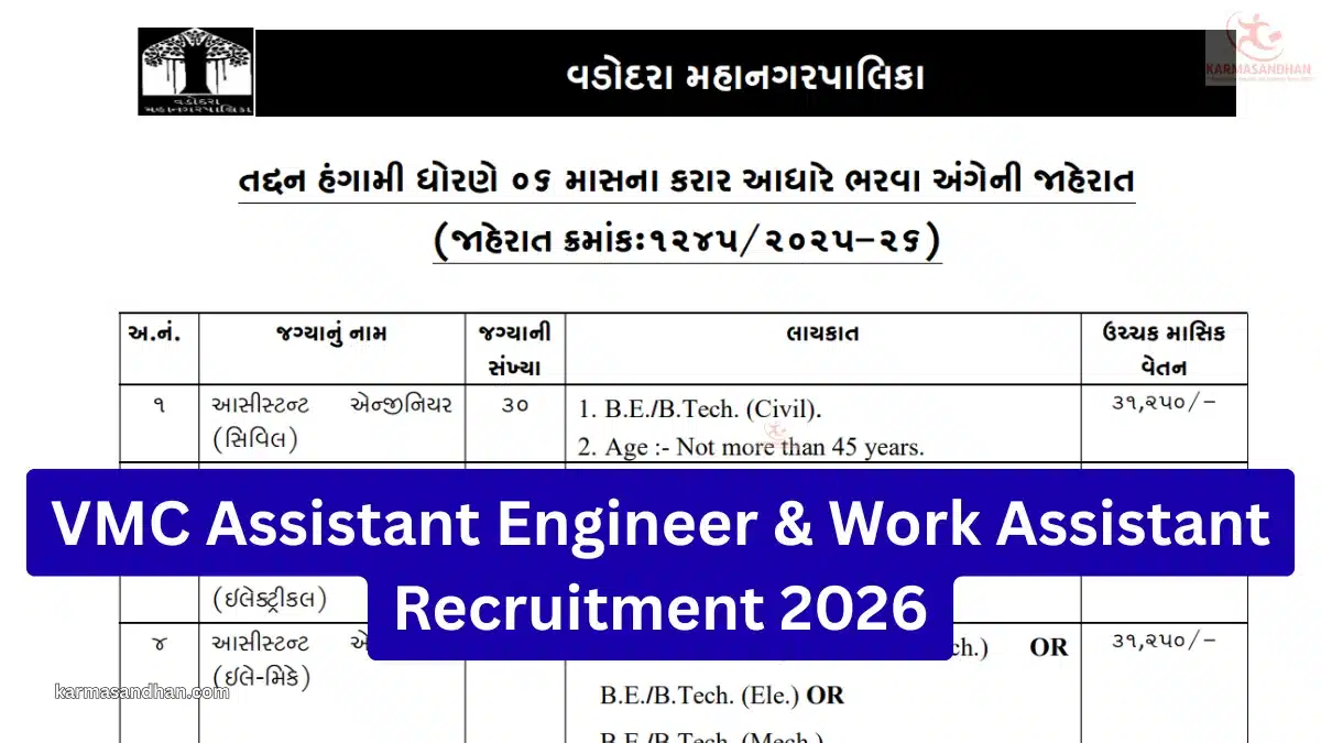 The Vadodara Mahanagar Palika (VMC) has released the official notification for VMC Recruitment 2026. A total of 200 vacancies have been announced for Assistant Engineer (Civil, Mechanical, Electrical, Electro-Mechanical) and Work Assistant (Civil, Mechanical, Electrical) posts.