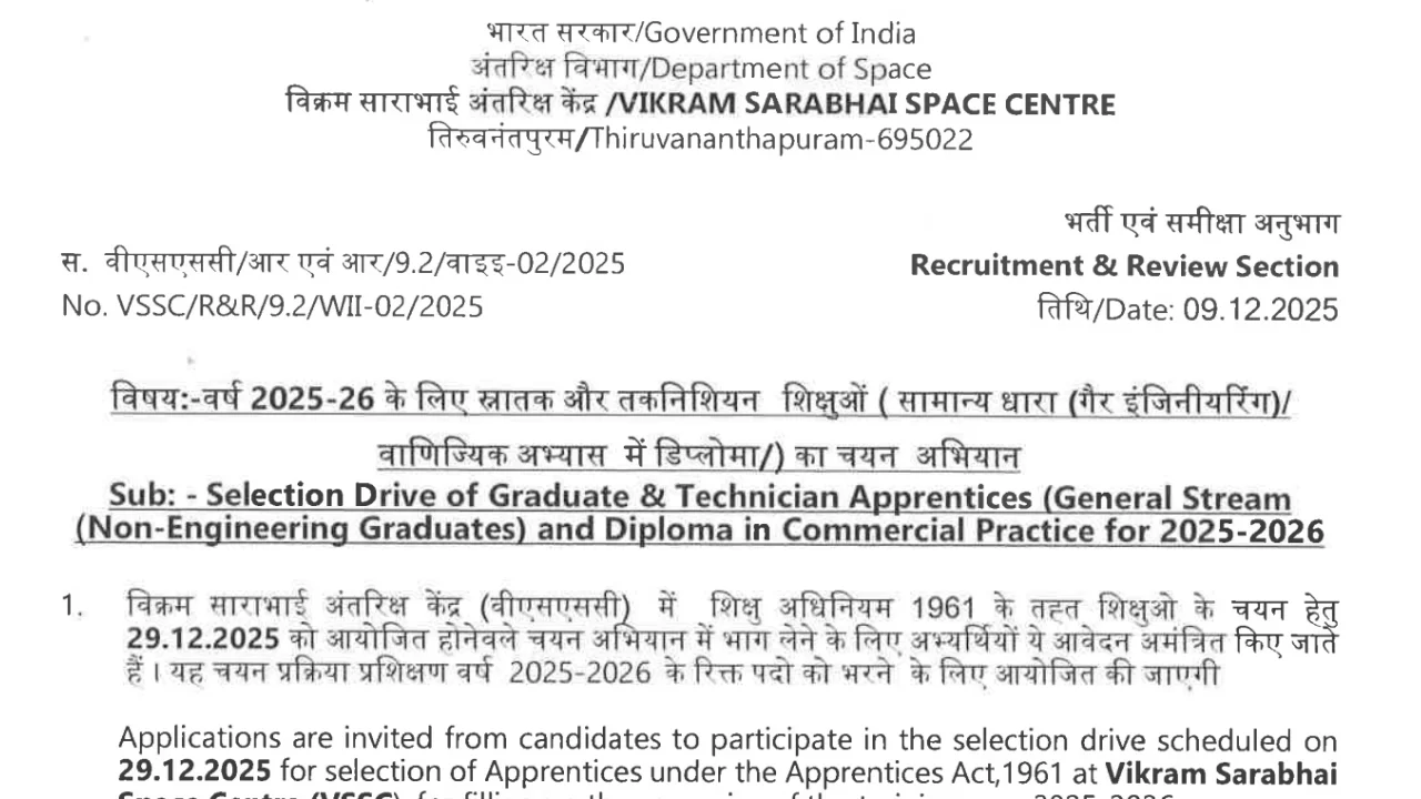 VSSC Apprentice Recruitment 2025 : Vikram Sarabhai Space Centre (VSSC) has released the notification for Graduate Technician Apprentices, General Stream Non-Engineering Graduates, and Diploma in Commercial Practice for 2025-2026 under the Apprentices Act, 1961. Applications are invited for a walk-in selection drive on December 29, 2025, at VSSC Guest House, ATF Area, Veli, near Veli Church, Thiruvananthapuram, Kerala, from 9:30 AM to 5:00 PM.
